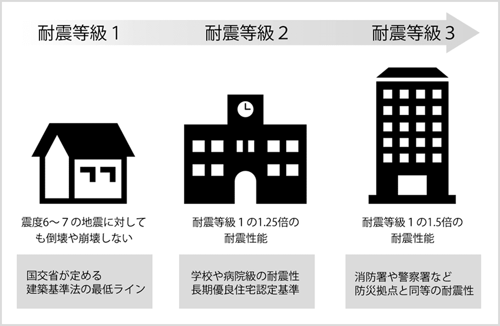 耐震等級とは、品確法の住宅性能表示制度に基づいて、建物の耐震性能を3 段階に分けて表示するもの。