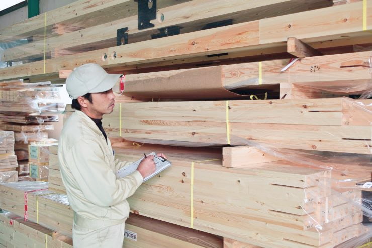 SE構法で使う材木は、全て一括管理された高精度の構造用集成材。使用する板1枚1枚強度を検査し、接着剤には実験にて強度と耐久性を確認したF☆☆☆☆品を使用しています。一本ごとに品質にばらつきのある無垢材と異なり、品質が安定しているので、構造計算に基づく確実な強度が担保できます。