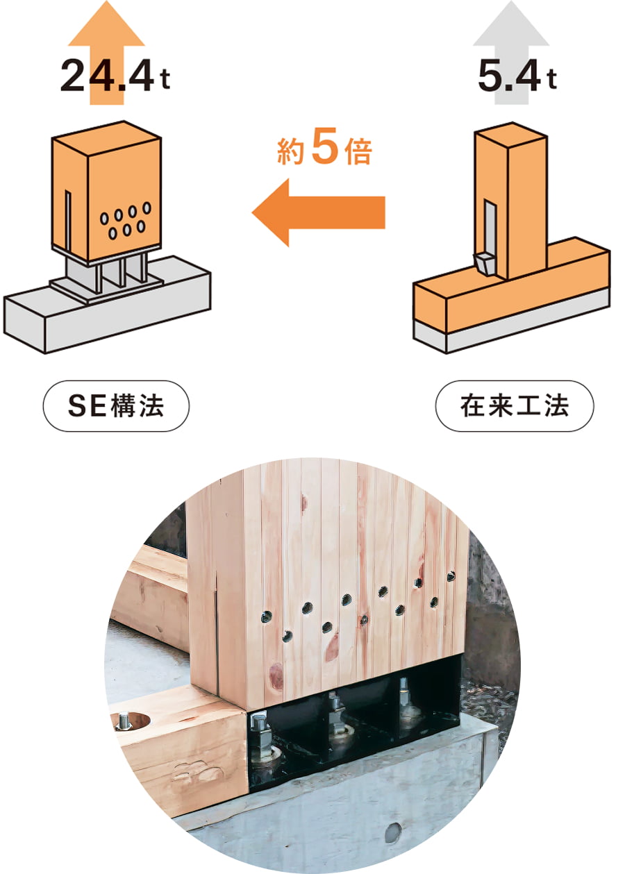 地震時によく見られるのが、横揺れにより柱や基礎や土台から引き抜けるケース。SE構法では、主要な柱の直下に柱脚金物を配置し柱と基礎を強固に固定。高強度なアンカーボルトで直接基礎に取り付けるので、地震の横揺れに強く、在来工法の5倍の引き抜き耐力を備えています。