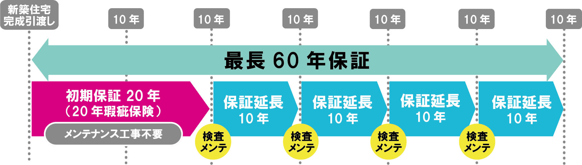 また、保険期間満了後も10年ごとに必要な検査・メンテナンスを行うことで、最大60年の長期保証を受けられます。