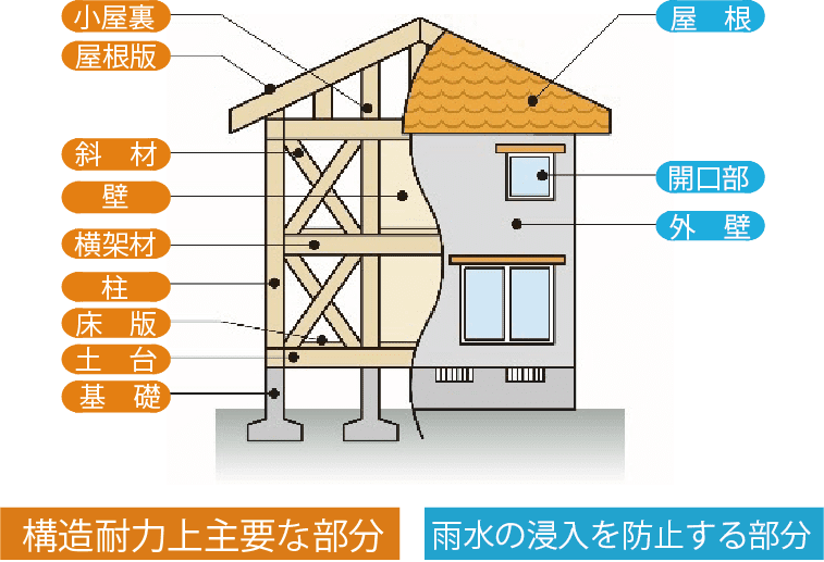 建物の基本構造部分(構造耐力上主要な部分および雨水の浸入を防止する部分)が対象です
